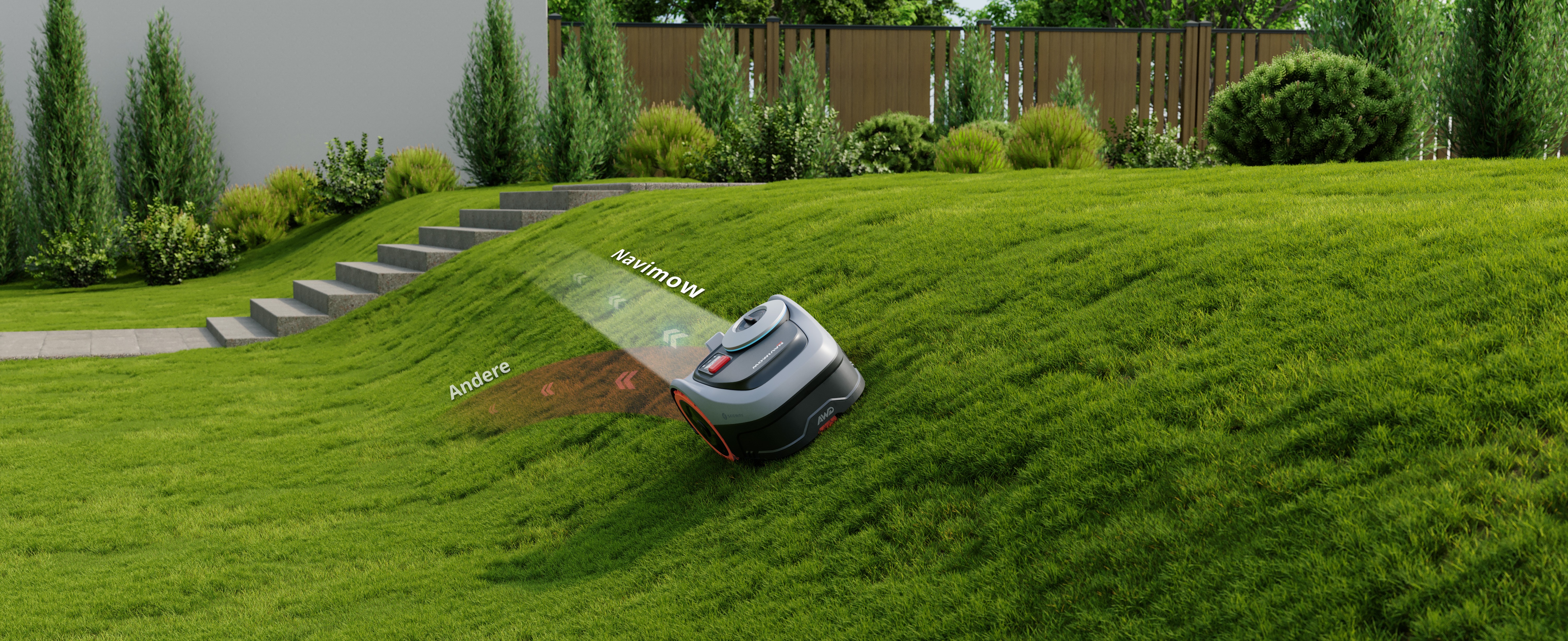 Die Navimow i2-Serie wurde für klassische Privatgärten konzipiert und wird als i2 AWD mit Xero-turn™-Allradtechnik mit einer Steigfähigkeit von bis zu 45 Prozent - er bleibt auch auf rutschigem Untergrund stabil.